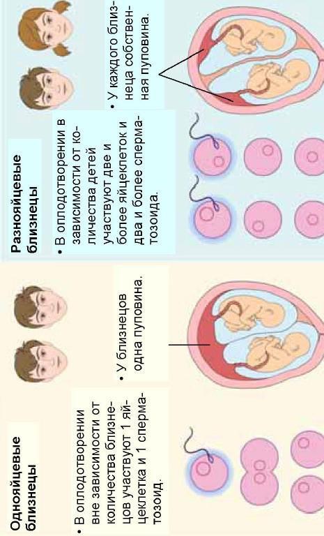 Разнояйцевые- в оплодотворение в зависимости от количества детей участвуют две и более яйцеклеток и два и более сперматозоида. У каждого близнеца собственная пуповина.