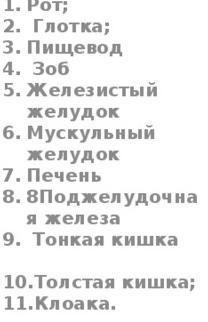 1 Глотка , 2 Толстая кишка, 3 Мускулистый желудок, 4 Пищевод, 5 Тонкая кишка, 6 Печень, 7 Слепая кишка, 8 Зоб, 9 зубы, 10 Анальное отверстие, 11 Железистый желудок, 12 Клоака, 13 Поджелудоч. железа, 15 Ротовое отверстие, 16 Клюв, 17 Желудок.