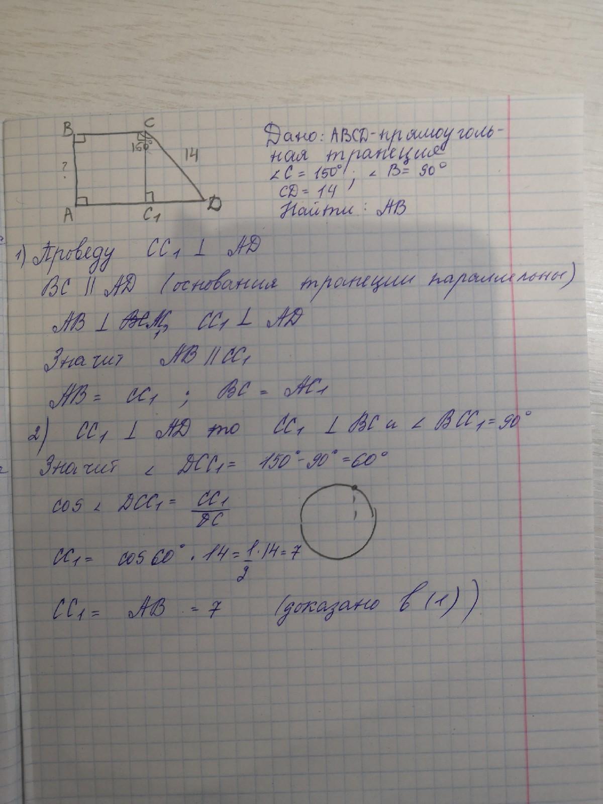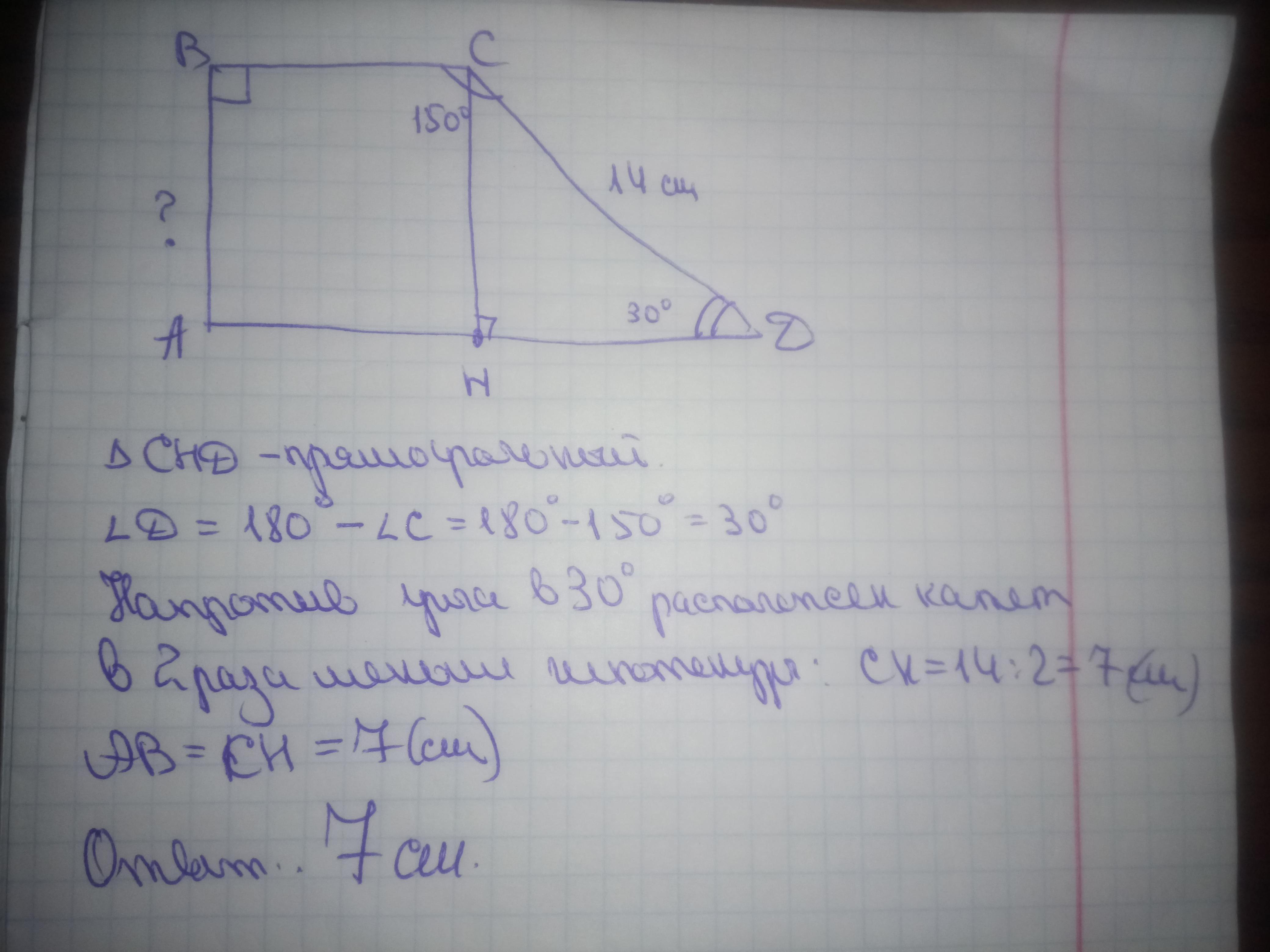 ABCD-прямоугольная трапеция,в которой угол С равен 150,угол B равен 90 наидите длину AB если известно что CD 14 см помогите умоляю завтра пересдача!!