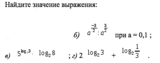 г) Аналогично б - 2 ^ (log 2 3) = 3, затем преобразуем : log 2 (8) + log 2 (1/3) - сумма логарифмов равна произведению : log 2 (8 / 3)