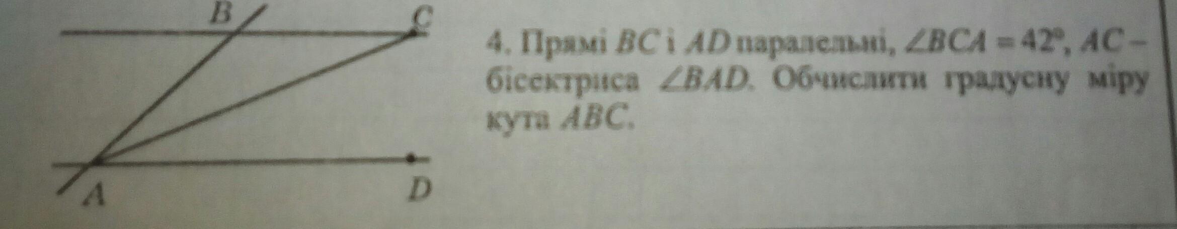 Т.к. АС - биссектрисса ∠ВАD, то ∠ВАС=∠САD=42 градуса.