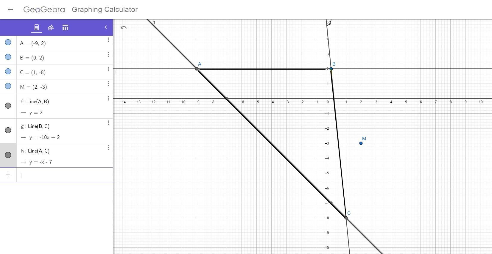 Определить, лежит ли точка М(2;-3) внутри треугольника ABC, с координатами A(-9;2), B(0;2), C(1;-8)
