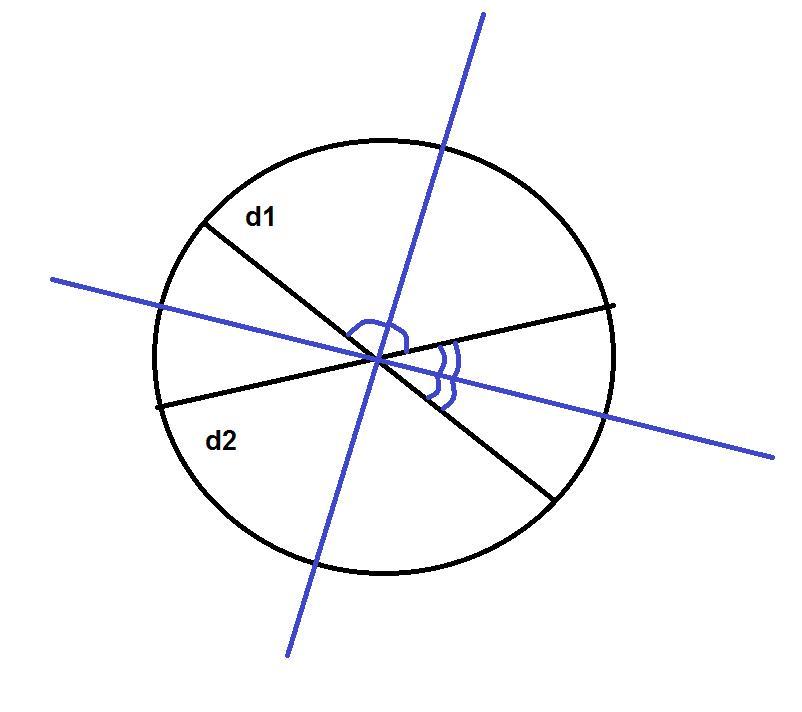 точки равноудаленные от двух диаметров будут находиться на биссектрисах углов образованных диаметрами