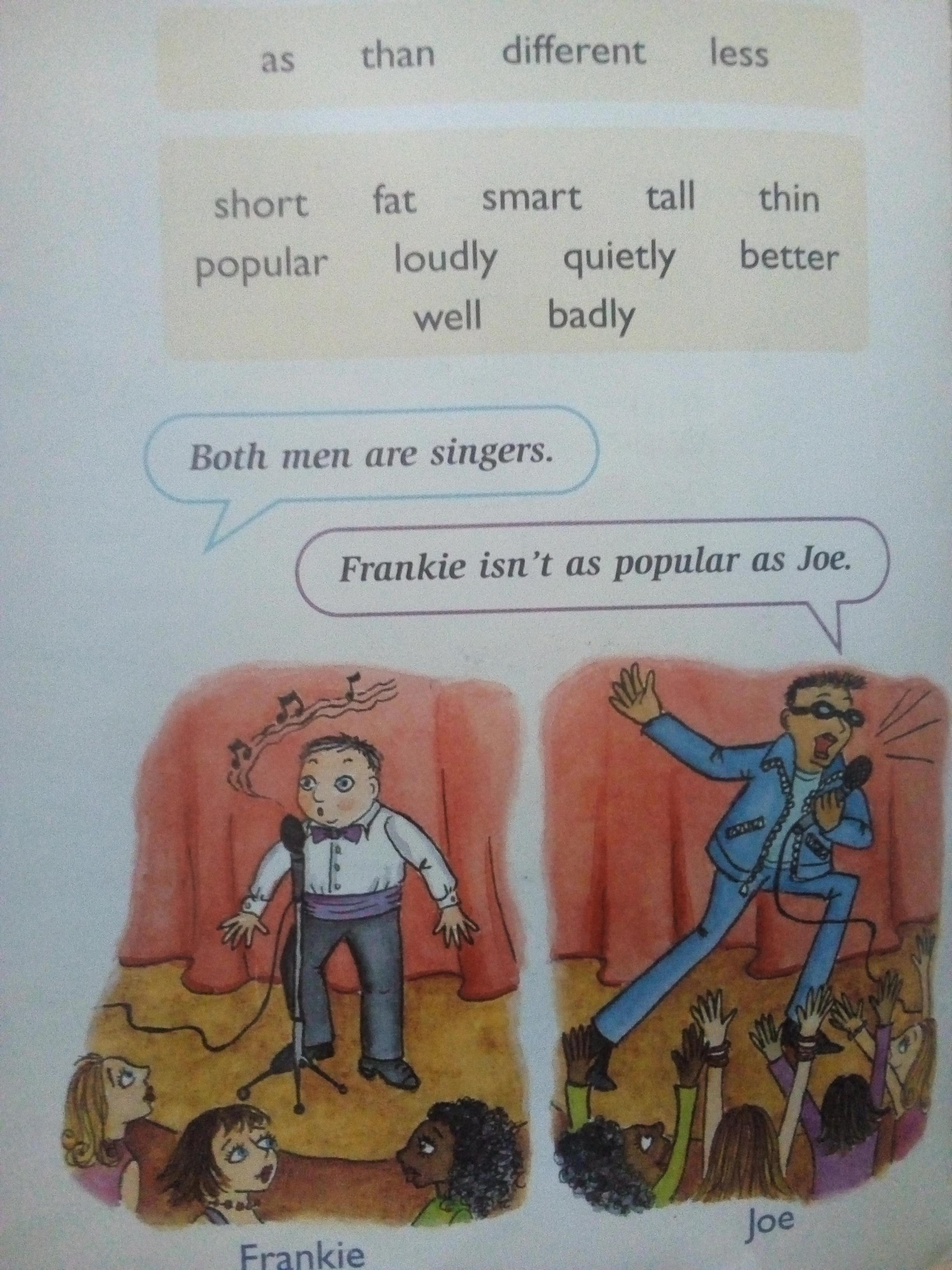 Frankie is as old as Joe. But Frankie isn't nearly as handsome as Joe.Joe doesn't sing as quietly as Frankie. Joe is not as short as Frankie. Frankie isn't as thin as Joe. I think Frankie is less popular than Joe.Frankie doesn't move better on the stage than Joe does. Joe's songs differ from Frankie's songs. They appeal to the young audience.