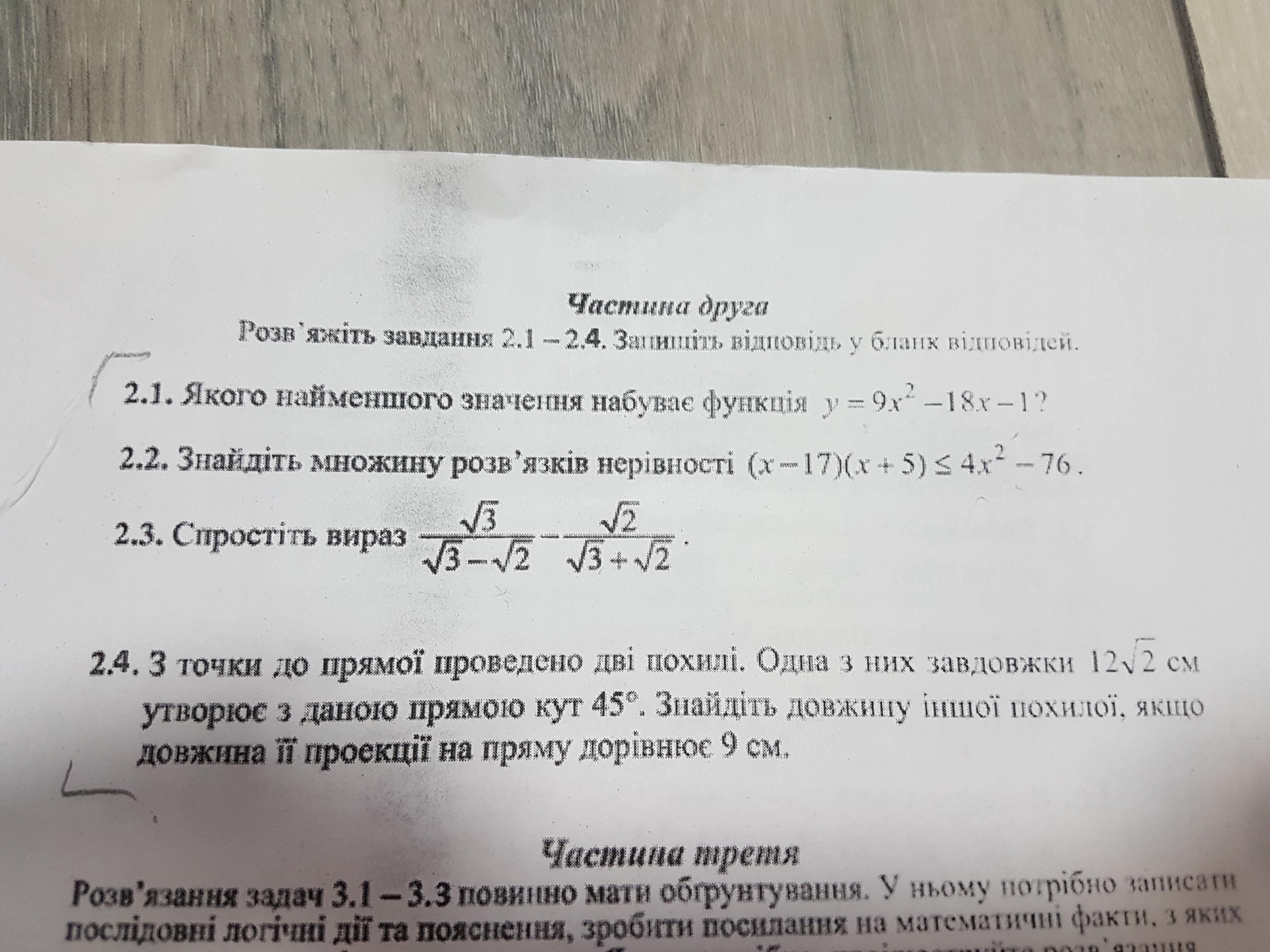 4. З точки до прямої проведено дві похилі. Одна з них завдовжки 12√3 см утворює з даною прямою кут 45градусів. Знайдіть довжину іншої похилої, якщо довжина її проекції на пряму дорівнює 9 см