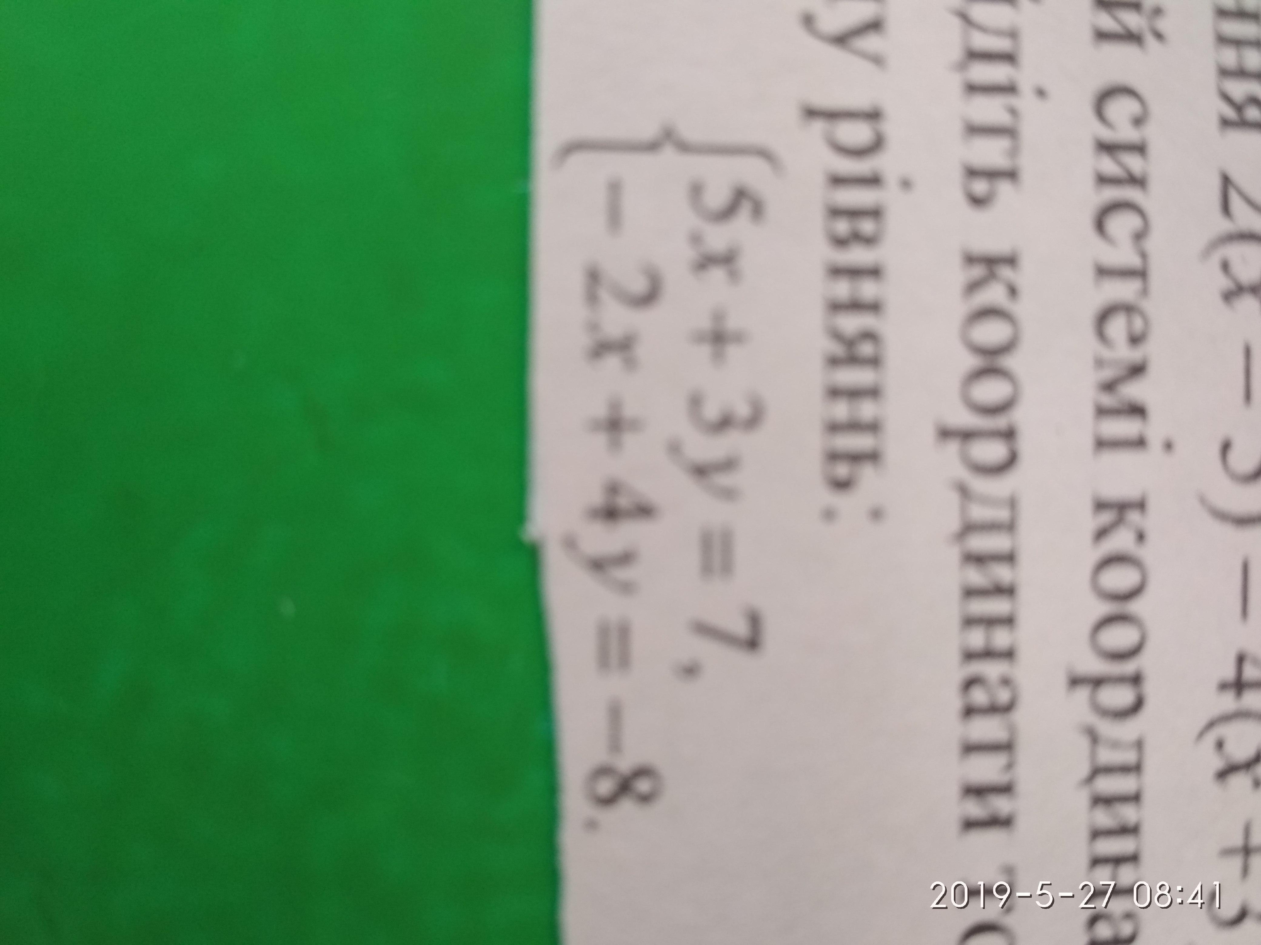 Умножьте второе уравнение на 2.5 получится (-5х+10y=-20) прибавляем второе уравнение к первому получаем --> 0х+13y=-13 из этого y= -1 теперь подставляем значение y в первое (или второе без разницы) и получаем 5х+3×(-1)=7 вычисляем и получается х=2. Для проверки можно поставить корни в первое или во второе уравнение подставим в первое 5×(5)+3×(-1)=7