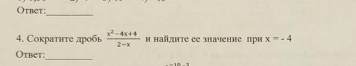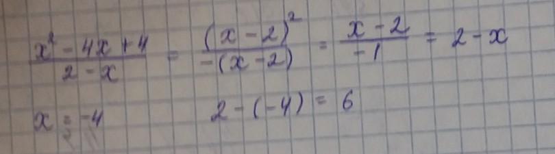 x^2-4x+4 / 2-x=(2-x)^2 / 2-x=2-x. подставляем значение: 2-(-4)=2+4=6. Ответ: 6.