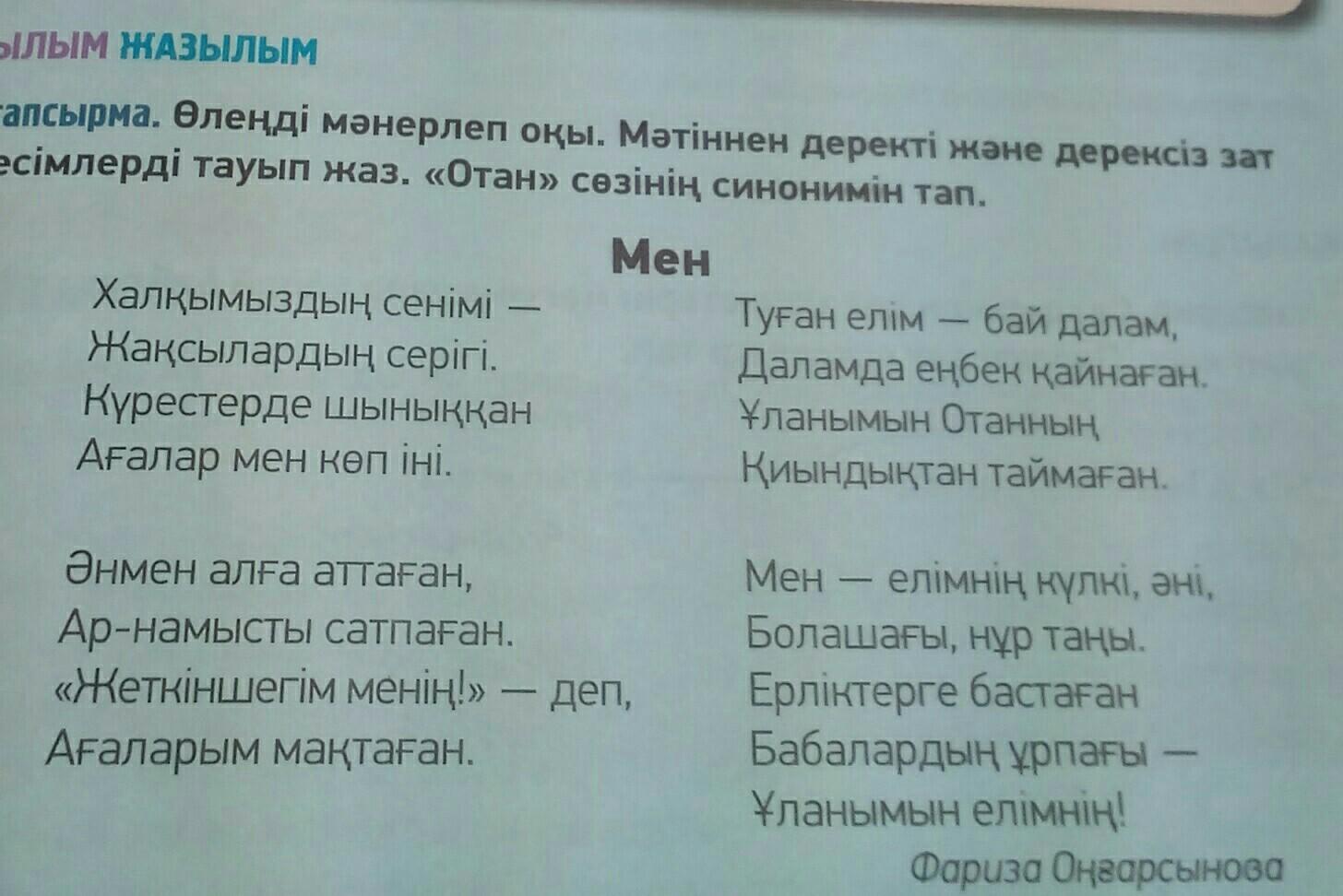 Өлеңді мәнерлеп оқы. Мәтіннен деректі дәне дерексіз зат есімлерді тауып жаз. «Отан» сөзінің синонимін тап.