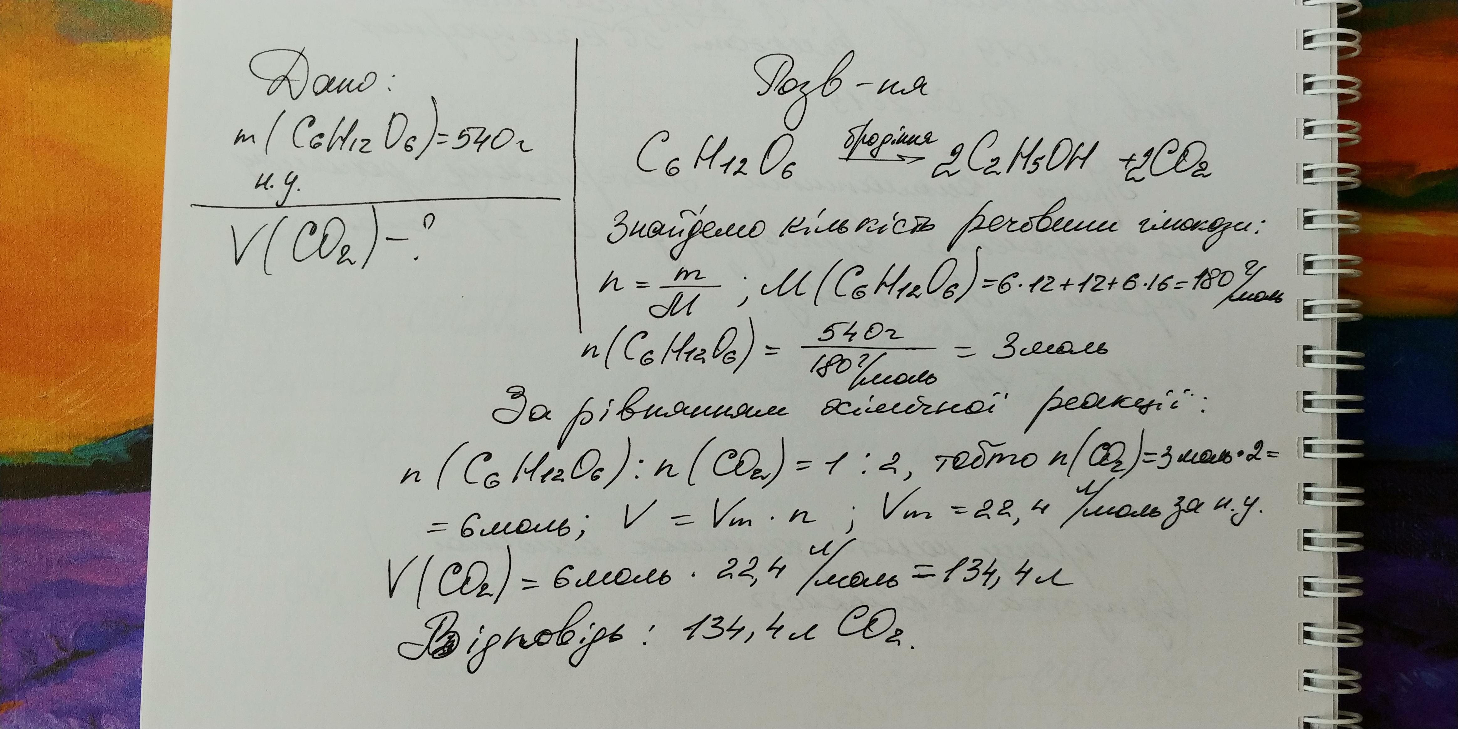 Обчисліть та вкажіть об'єм вуглекислого газу (н.у.), що виділяється при спиртовому бродінні глюкози масою 540г