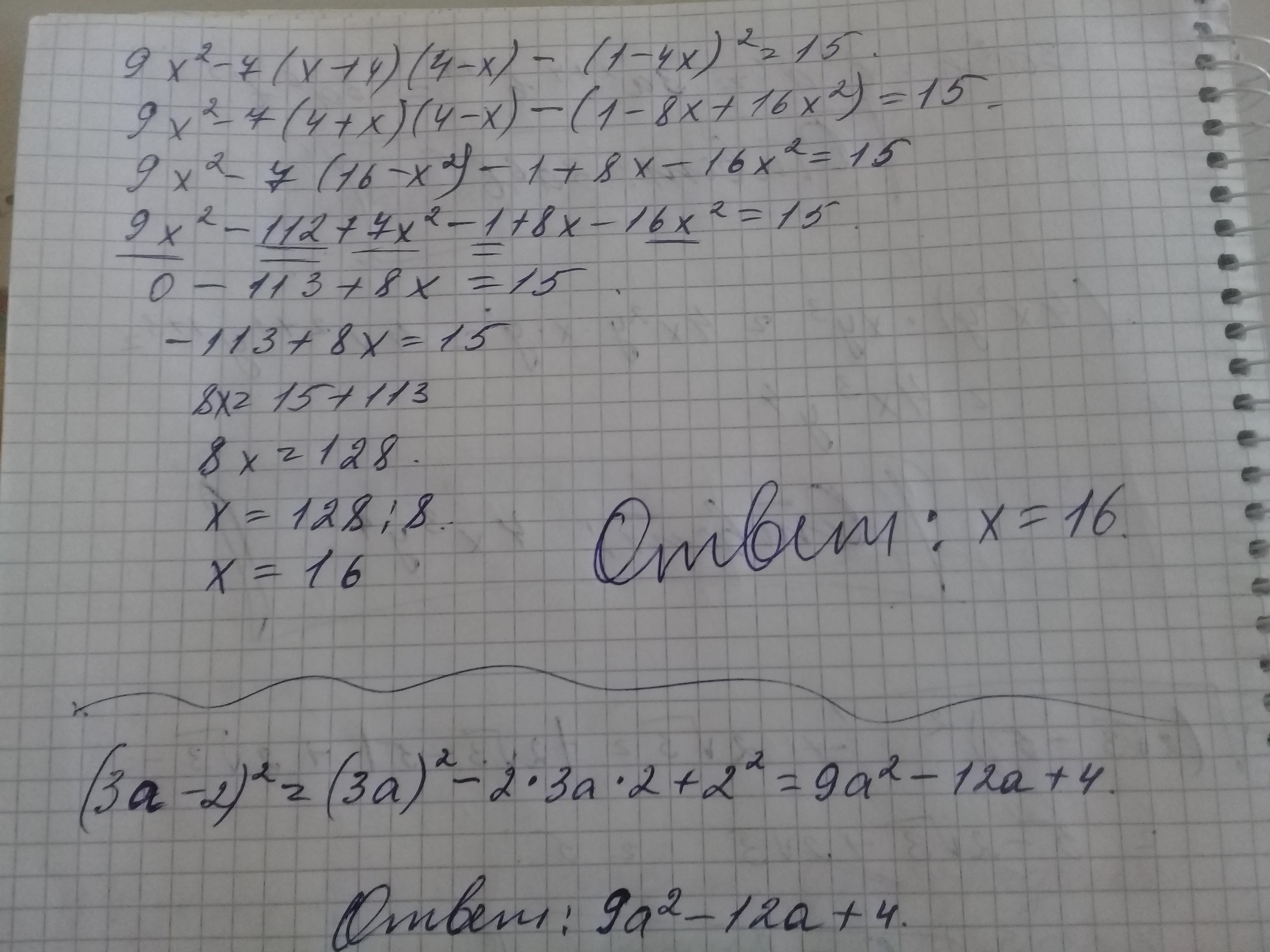 9х²-7 (4+х) (4-х)- (1-8х+16х²) =15