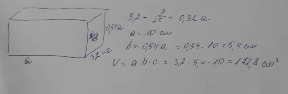 Ширина прямокутного паралелепіпеда дорівнює 3,2 см, що становить 8/25 його довжини, а висота дорівнює 54%довжини. Обчислити об'єм паралелепіпеда.