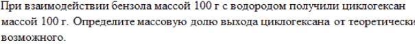 При взаимодействии бензола массой 100 г с водородом получили циклогексан массой 100 г. Определите массовую долю выхода циклогексана от теоретически возможного.