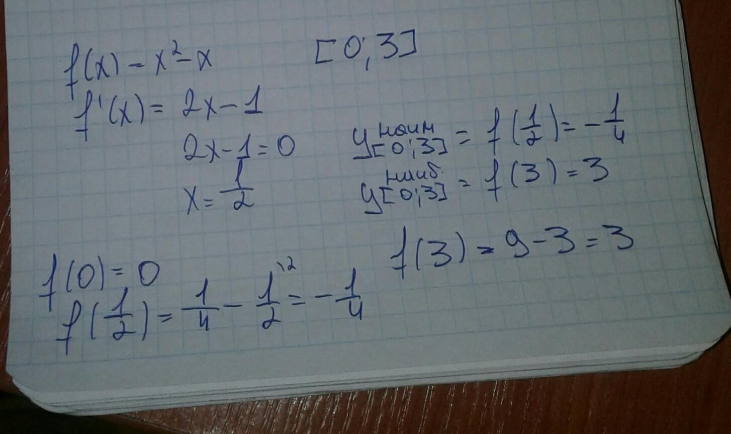 Відодомо ,що f'(x) =x²-x.знайдіть критичні точки .Знайдіть найбільше і найменше значення функції f(x)=x²-x на відрізну [0;3]