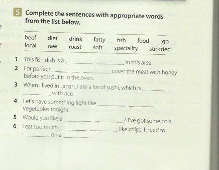 1 local speciality 2 roast beef 3 raw fish 4 stir-fried 5soft drink 6 fatty food -go on a diet