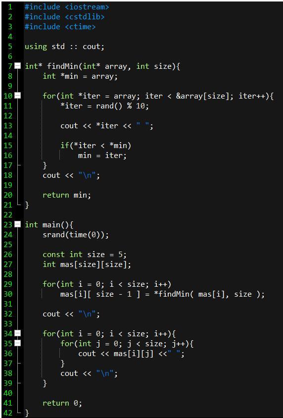 cout << "Определить минимальный элемент в каждой строке и заменить каждый элемент в последнем столбце на этот минимальный элемент. " << endl;