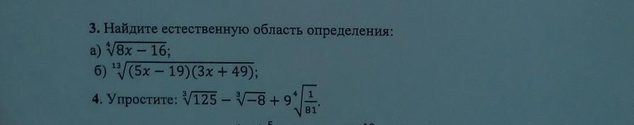 3. а). так как у нас корень четной степени, следовательно подкоренное выражение не может быть отрицательным. получаем: 8x-16>=0; 8x>=16; x>=2. Ответ: x>=2. б). x-любое число. 4). решение: 5-(-2)+9*1/3=5+2+3=10. Ответ: 10. я так думаю.