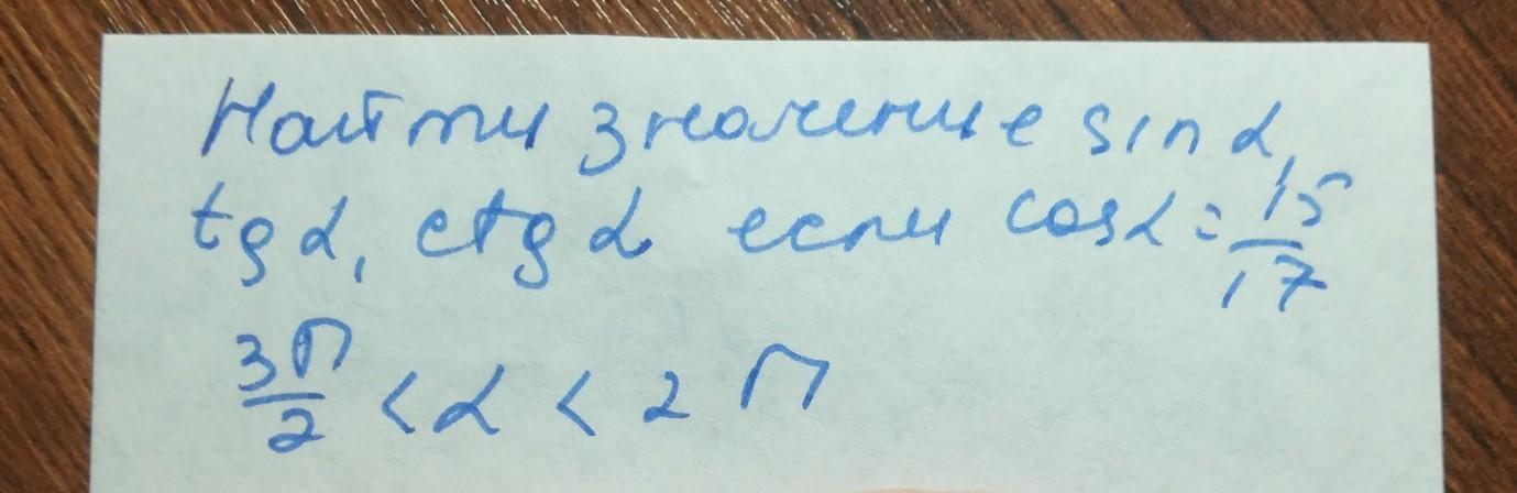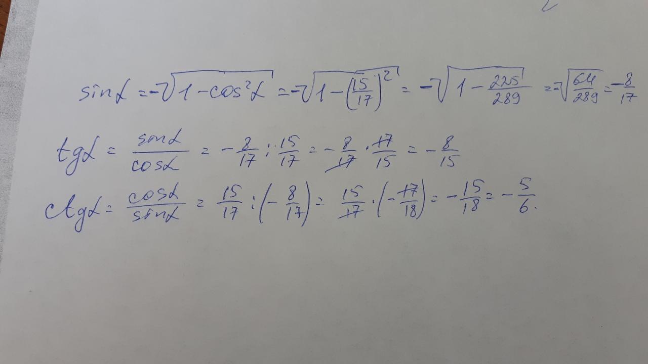 sin=sqrt(1-cos^2)=sqrt(1-(15/17)^2)=sqrt(17^2-15^2)/17=+- 8/17