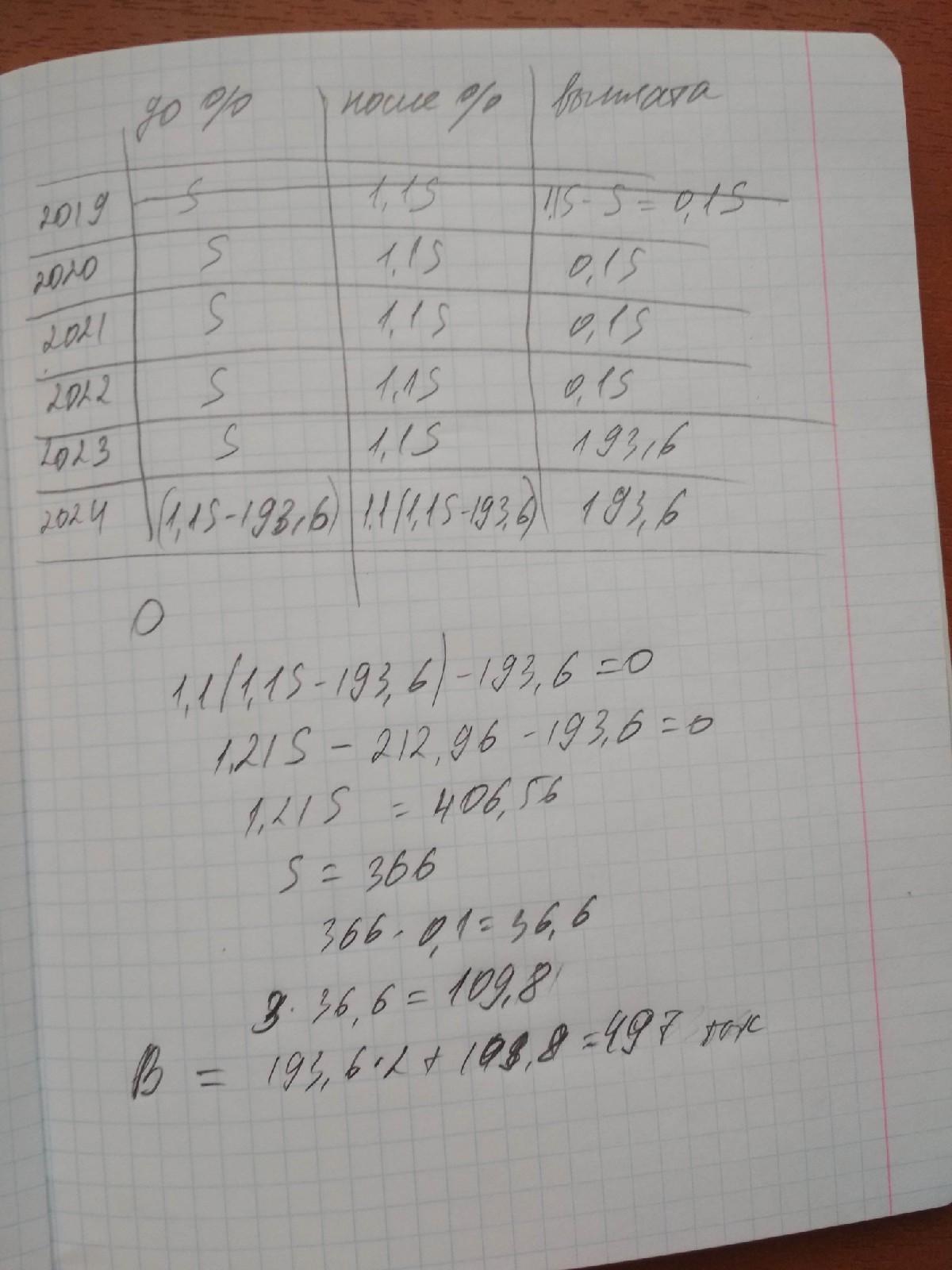 Сначала платим банку только проценты, чтобы сумма долга была всегда S. Это посчитаем чуть позже, а пока нас интересуют последние два года. Составляем уравнение, находим S. Находим процент - выплаты за 3 года, умножаем, соответственно, на 3. Прибавляем выплаты за последние два года.