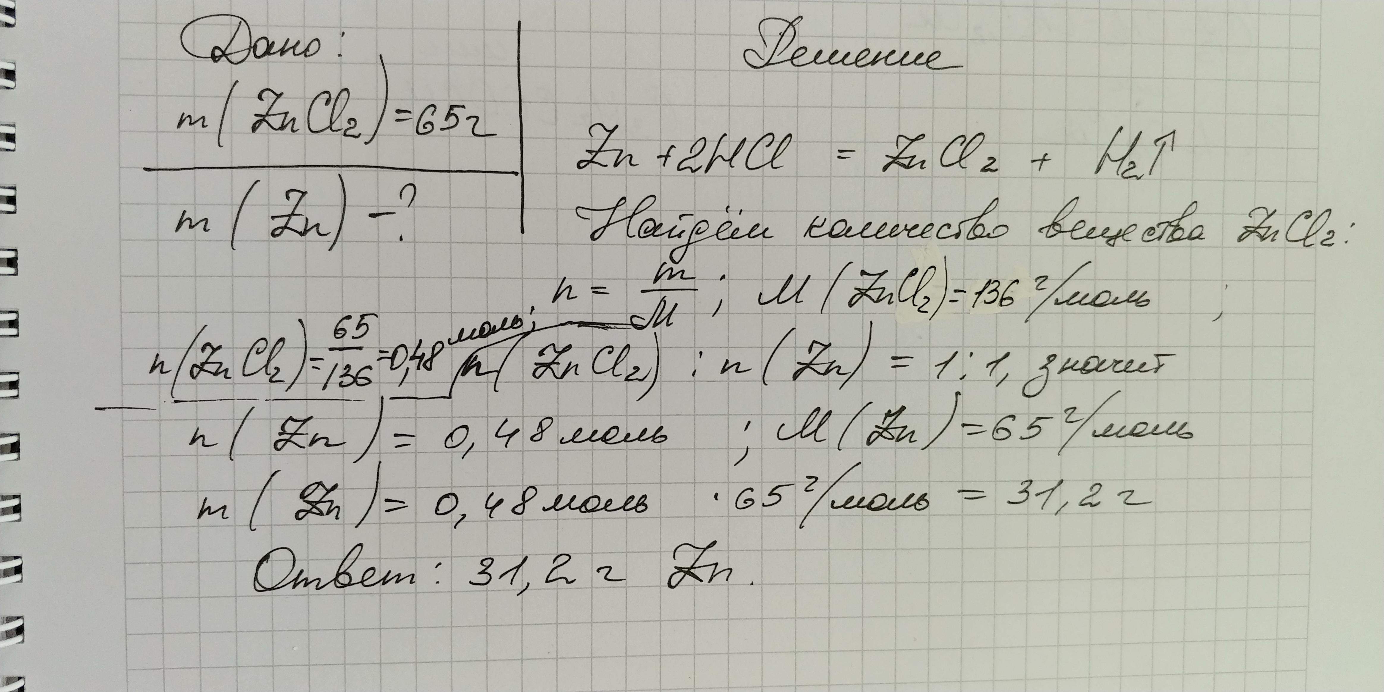 ВЫЧИСЛИТА МАССУ ЦИНКА ,НЕОБХОДИМУЮ ДЛЯ ПОЛУЧЕНИЯ 65Г ХЛОРИДА ЦИНКА ПРИ ВЗАИМОДЕЙСТВИИ ЕГО С ИЗБЫТКОМ СОЛЯНОЙ КИСЛОТЫ