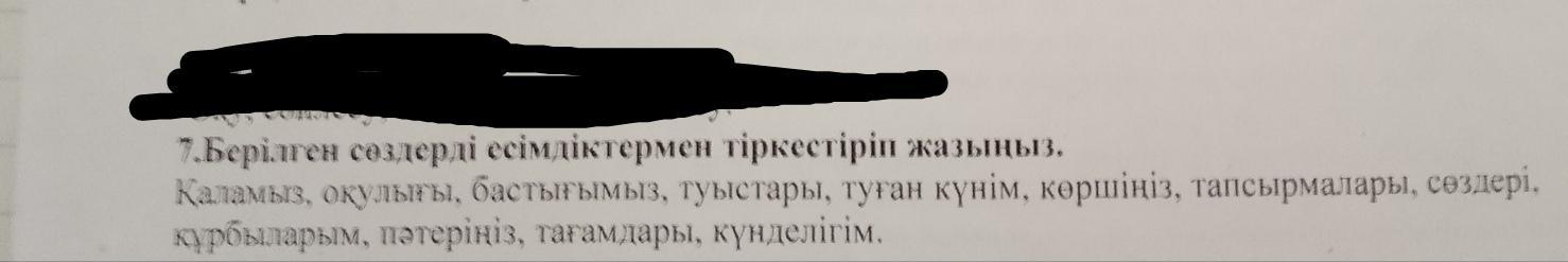Біздің қаламыз, оның оқулығы, біздің бастығымыз, олардың туыстары, менің туған күнім, сіздің көршіңіз, олардың тапсырмалары, олардың сөздері, менің құрбыларым, сіздің пәтеріңіз, олардың тағамдары, менің күнделігім