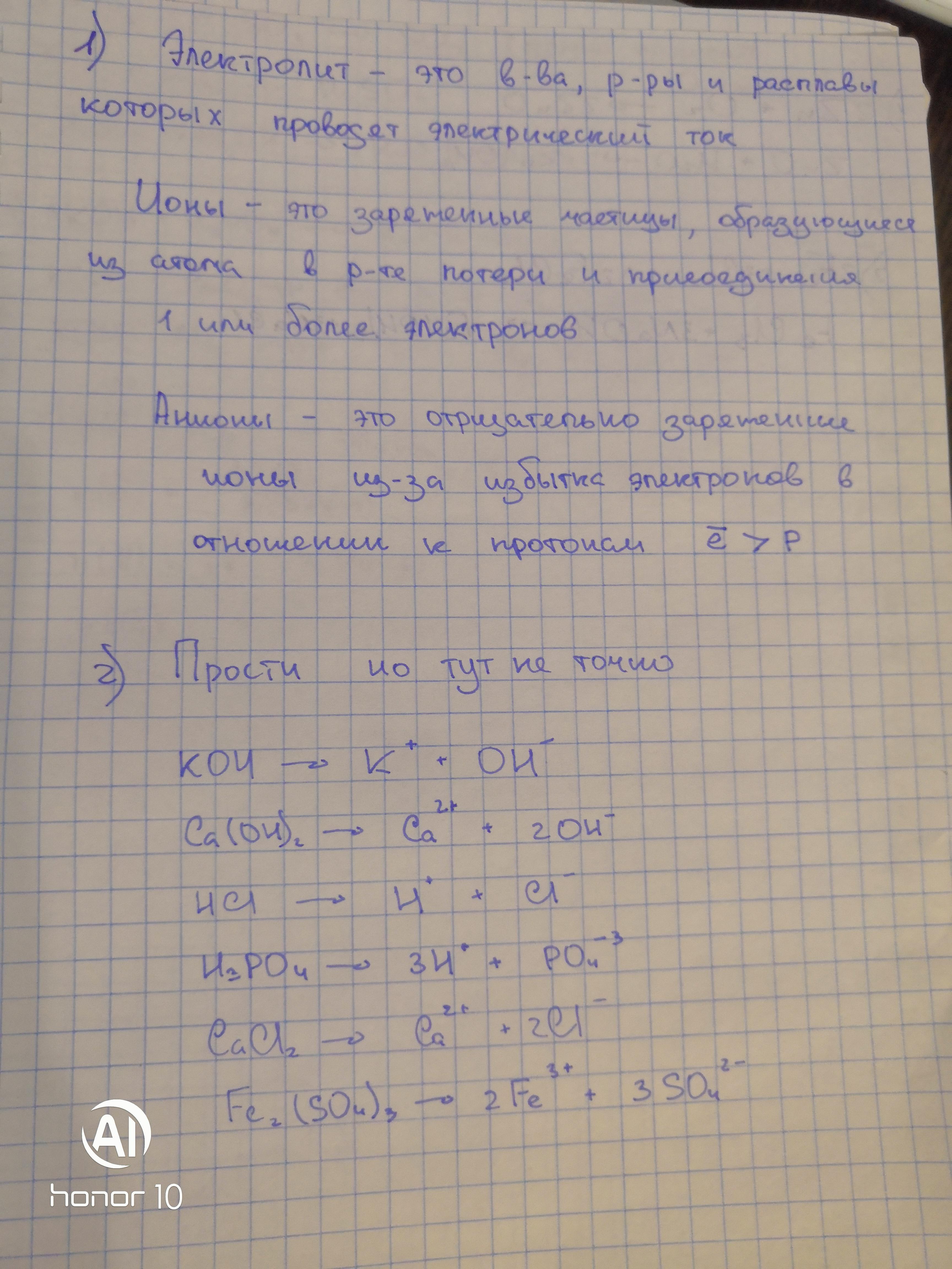 2. Написать диссоциацию растворов: гидроксида калия, гидроксида кальция, соляной кислоты, фосфорной кислоты, хлорида кальция, сульфата железа (3)