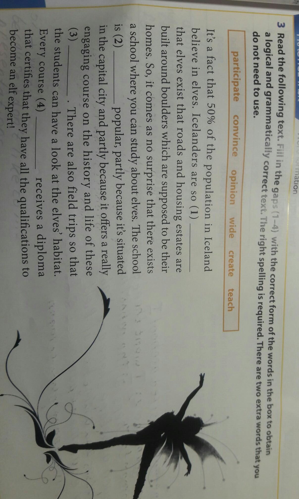 It's a fact that 50% of the population in Iceland believe in elves. Icelanders are so (1) convinced that elves exist that roads and housing estates are built around boulders which are supposed to be their homes. So, it comes as no surprise that there exists a school where you can study about elves. The school is (2) widely popular, partly because it's situated in the capital city and partly because it offers a really engaging course on the history and life of these (3) creatures. There are also field trips so that the students can have a look at the elves' habitat. Every course (4) participatant receives a diploma that certifies that they have all the qualifications to become an elf expert!