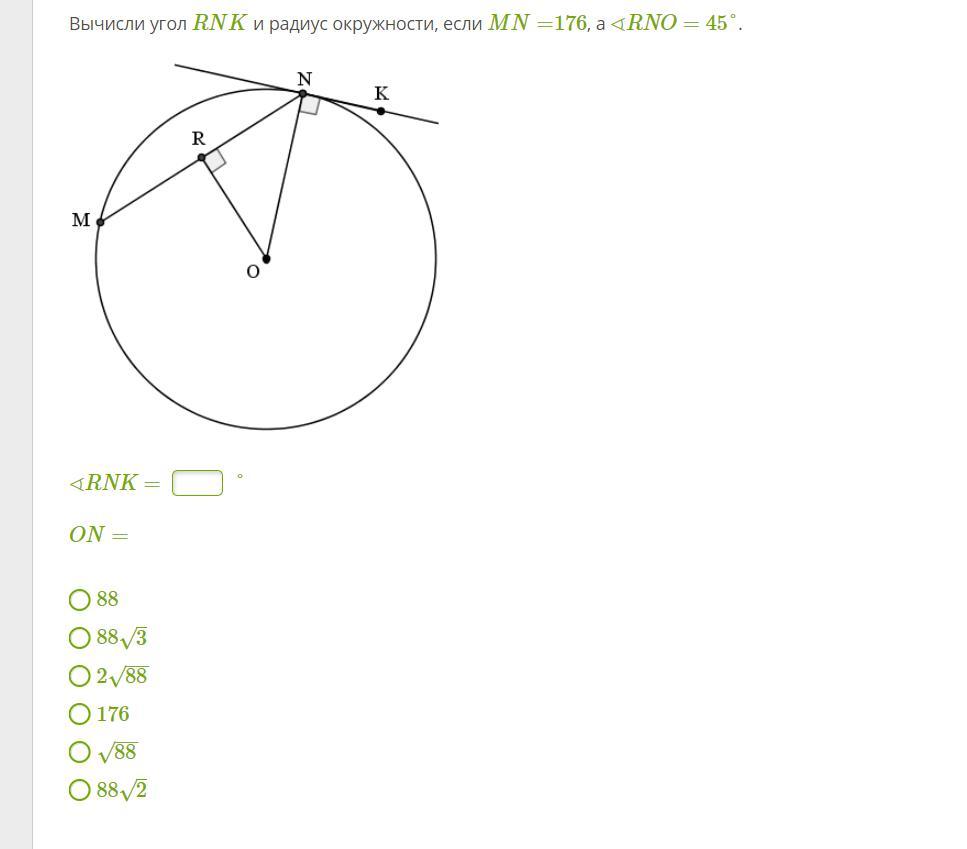 Треугольник RNO-равнобедренный, со стороной 176/2=88, а основание ON, и он же радиус будет равен 88корень2