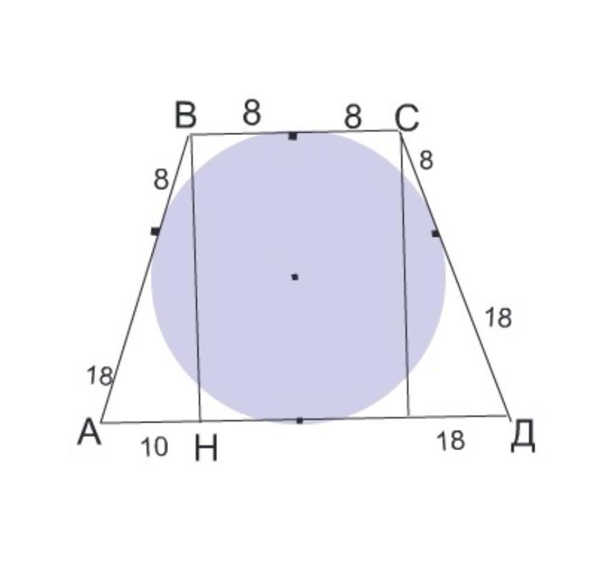 коло вписане в рівнобічну трапецію,ділить точкою дотикубічну сторону на вiдрізки за довжиною 8 см і 18 с. знайдіть площу трапеції