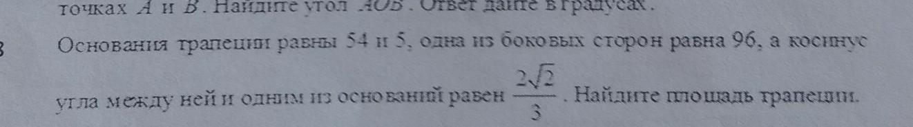 основания трапеции равны 54 и 5 одна из боковых сторон равна 96 а косинус угла между ней и одним из оснований равен 2 корень из 2 деленное на 3 найдите площадь трапеции