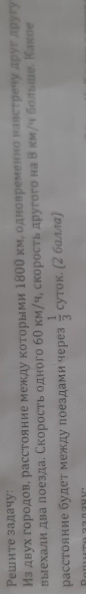 Из двух городов расстояние между которыми 1800 км Одновременно навстречу друг другу выехали два поезда Скорость одного 60 км ч скорость другого на 8 км больше Какое расстояние будет между поездами через 3 суток