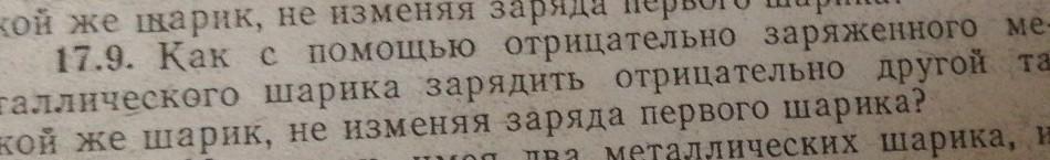 Я долго думаю над этой задачей, но всё равно не могу понять её решение, предложенное в конце задачника. В нём написано, что вначале следует получить положительный заряд на каком-то другом проводнике с помощью имеющегося отрицательно заряженного шарика — поднести заряженный шарик к этому незаряженному проводнику, не касаясь, и затем достаточно на короткое время прикоснуться к проводнику пальцем.