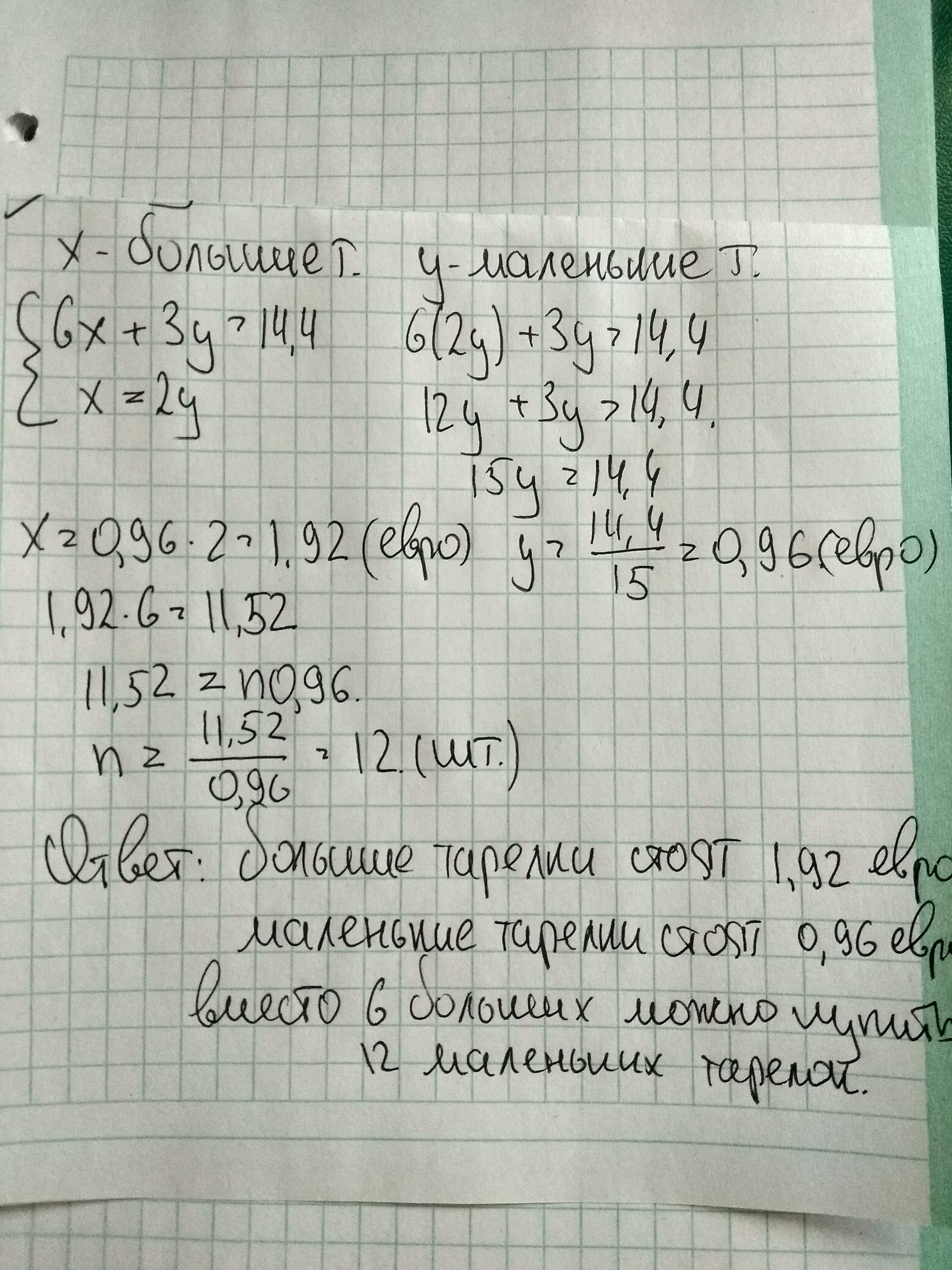 Далее я стоимость маленьких тарелок удвоил, т.к. в условии написано, что цена маленьких в 2 раза меньше цены больших тарелок. В итоге получил 1,92 евро.