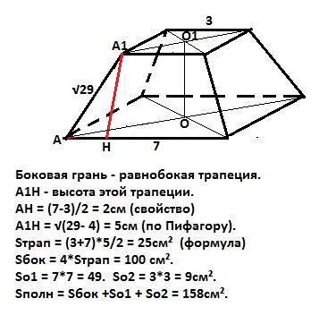 в правильной четырехугольной усеченной пирамиде длины сторон оснований равны 7м и 3м, боковое ребро корень 29