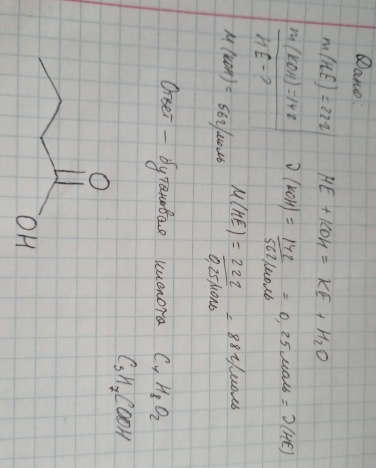 определите молекулярную формулу одноосновной кислоты на нейтрализацию 22 граммов которой затратилось 14 граммов гидроксида калия.составьте ее структурную формулу