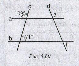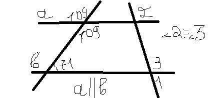 углы 71 и угол, вертикальный углу 109 (тоже=109) являются односторонними при прямых а,в и секущей с