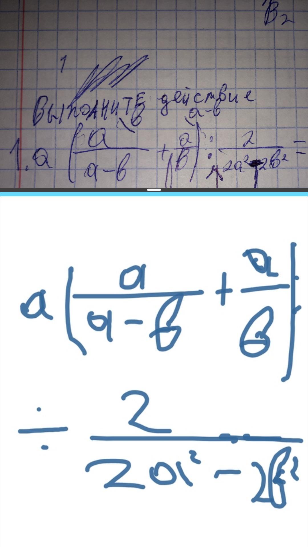 a( frac{a}{a - b}  +  frac{a}{b} ) div  frac{2}{2a {}^{2} - 2b {}^{2}  }  =frac{a {}^{4}   +  a {}^{3}b }{b}  \ 1) :  :  :  : frac{a}{a - b}   +  frac{a}{b} =  frac{ab + a(a - b)}{b(a - b)}  =  frac{ab + a {}^{2}  - ab}{ba - b {}^{2} } =  frac{  a {}^{2} }{ba - b {}^{2} }    \ 2)a times frac{a {}^{2} }{ba - b {}^{2} }   =  frac{a times a {}^{2}  }{ba - b {}^{2}}  =  frac{  a {}^{3}  }{ ba - b {}^{2} } \ 3) frac{  a {}^{3}  }{ ba - b {}^{2} }  div frac{2}{2a {}^{2} - 2b {}^{2}  } =  frac{  a {}^{3}  }{ ba - b {}^{2} }  times  frac{2a {}^{2} - 2b {}^{2} }{2}  =    frac{  a {}^{3}  }{ b(a - b) }  times  frac{2(a - b)(a + b)}{2}  =  frac{a {}^{3}(a + b) }{b}  = frac{a {}^{4}   +  a {}^{3}b }{b}
