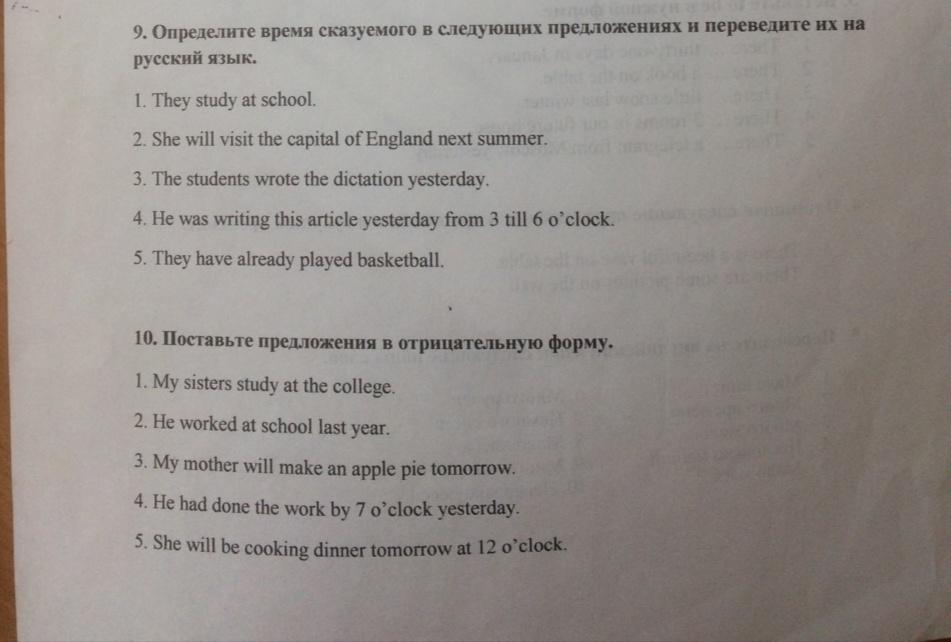 9. 1 Навчання у школі. 2.Вонa відвідуватиме столицю Англії наступного літа. 3. Студенти писали диктант учора. 4.Учора він писав цю статтю з 3 до 6 години. 5.Вони уже грали в баскетбол. 1 речення-теперішній час,2 -майбутній час 3-5-минулий час. 10. 1.My sister a did not at the college. 2.He did not worked at the scool last year. 3.Tomorrow my mother will not make an apple pie.4.Yesterday by 7 o'clock He did not had done the work.5.Tomorrow at 12 o'clock she did not will be cooking dinner.