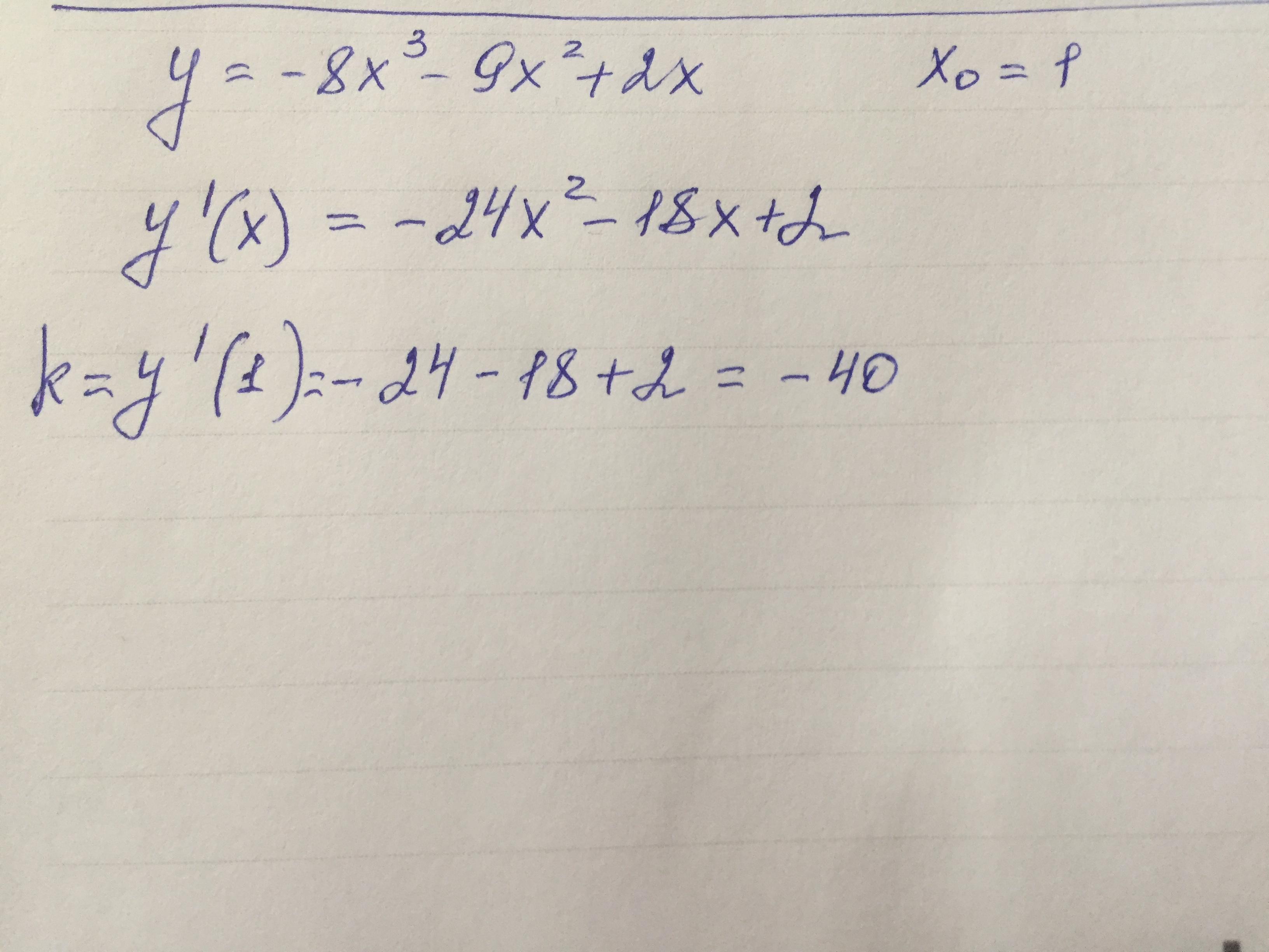 Найдите угловой коэффициент касательной, проведенной к графику функции y=-8x^3-9x^2+2x в точке с абсциссой равной 1.