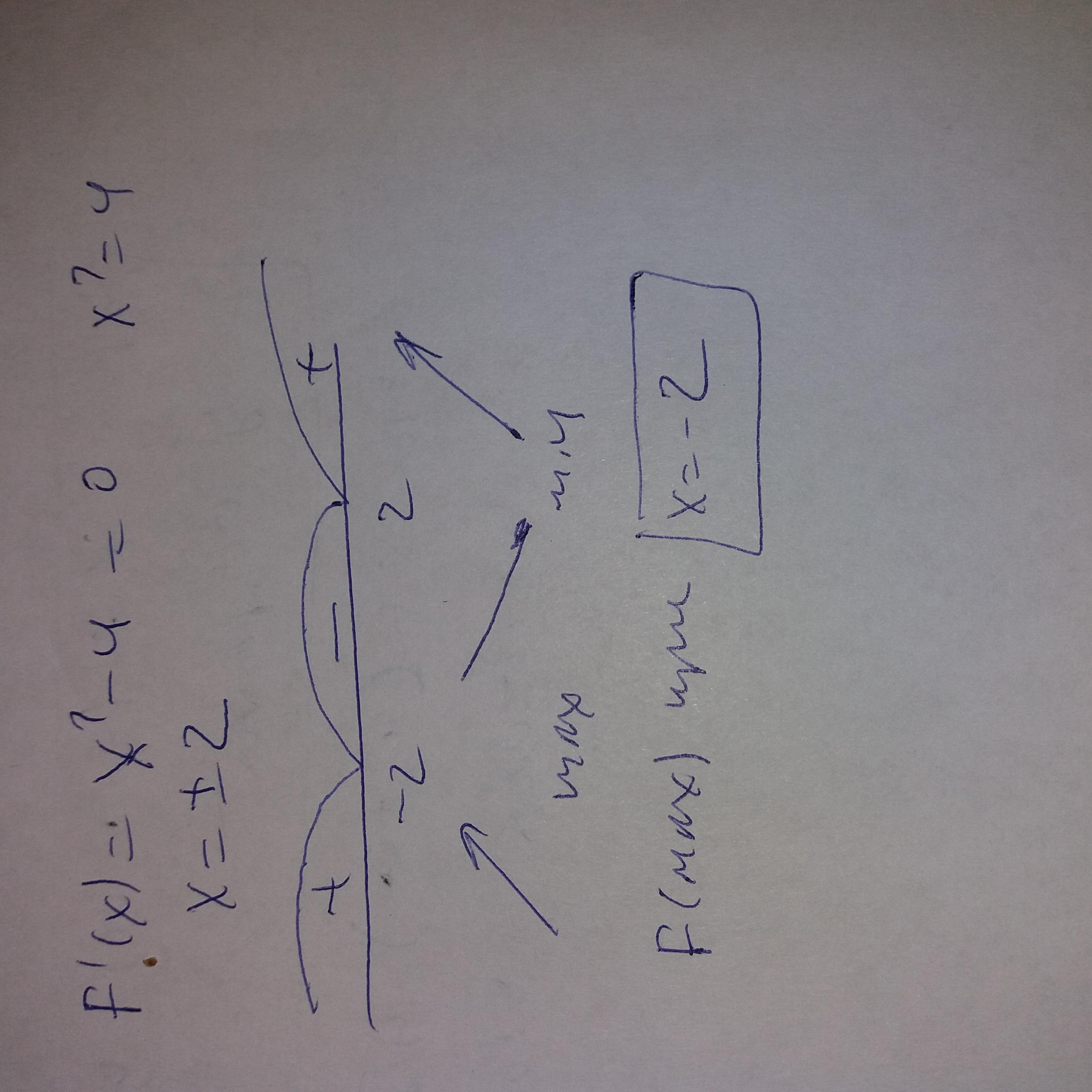 Осталось выяснить, что известно о функции, непрерывна ли она? Так как это функция у = х³/3-4х+с, т.е. она определена всюду, то ее производная везде определена. Тогда х=±2 - точки области определения являются критическими, и можно выяснять вопрос о точках максимума. Так как по методу интервалов