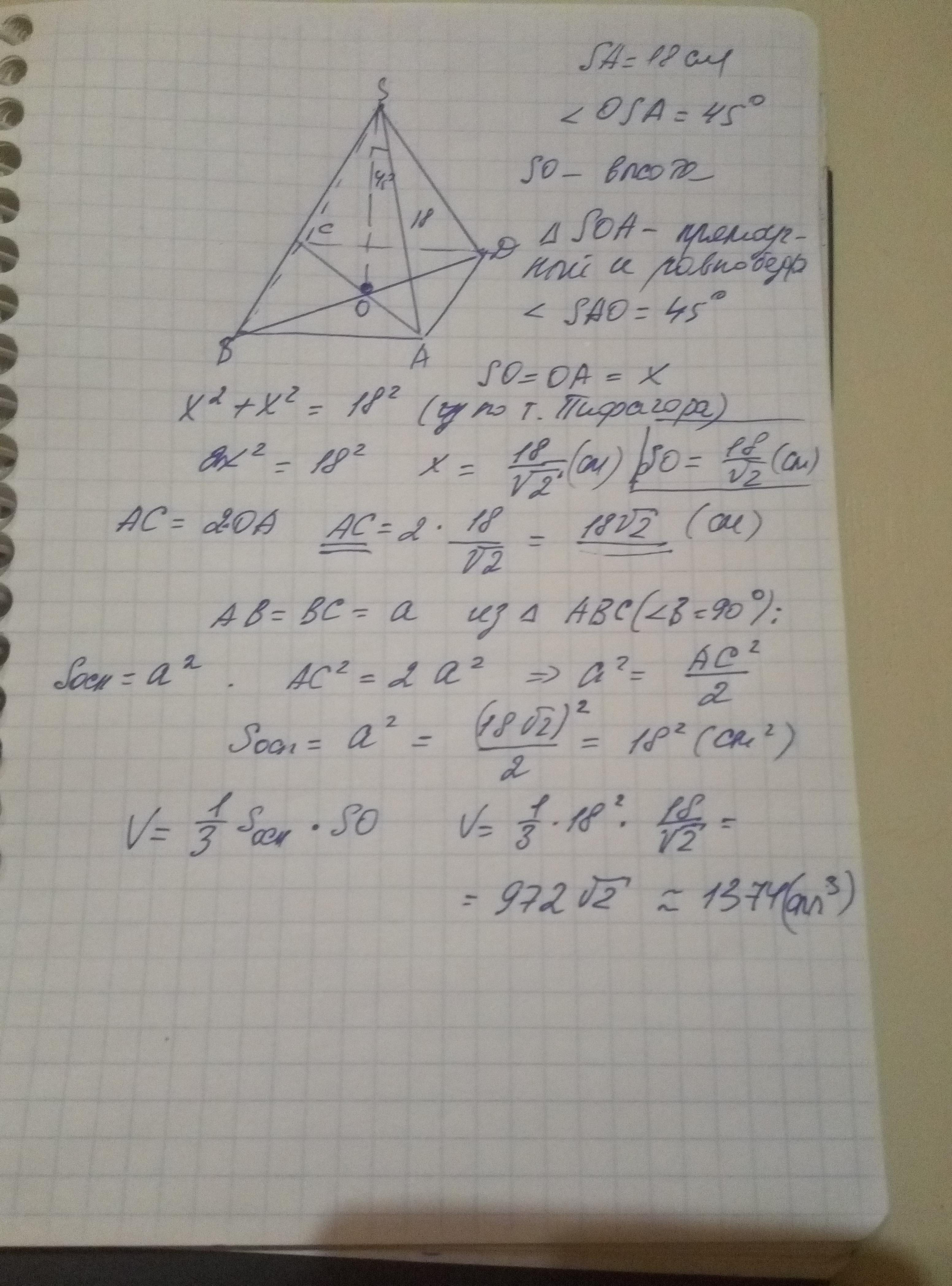 Знайти об'єм правильної чотирикутної піраміди, бічне ребро якої дорівнює 18см і утворює з висотою піраміди кут 45°. Даю 34 швидше фотографією скиньте