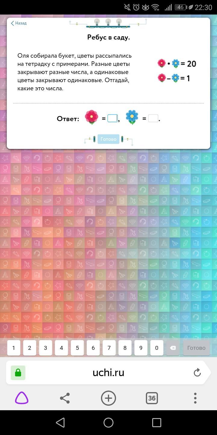 2 однозначных числа при умножении друг на друга дали 20. Это только одна пара чисел: 5 и 4. Какой из цветков 5, а какой - 4 очевидно из второй записи.