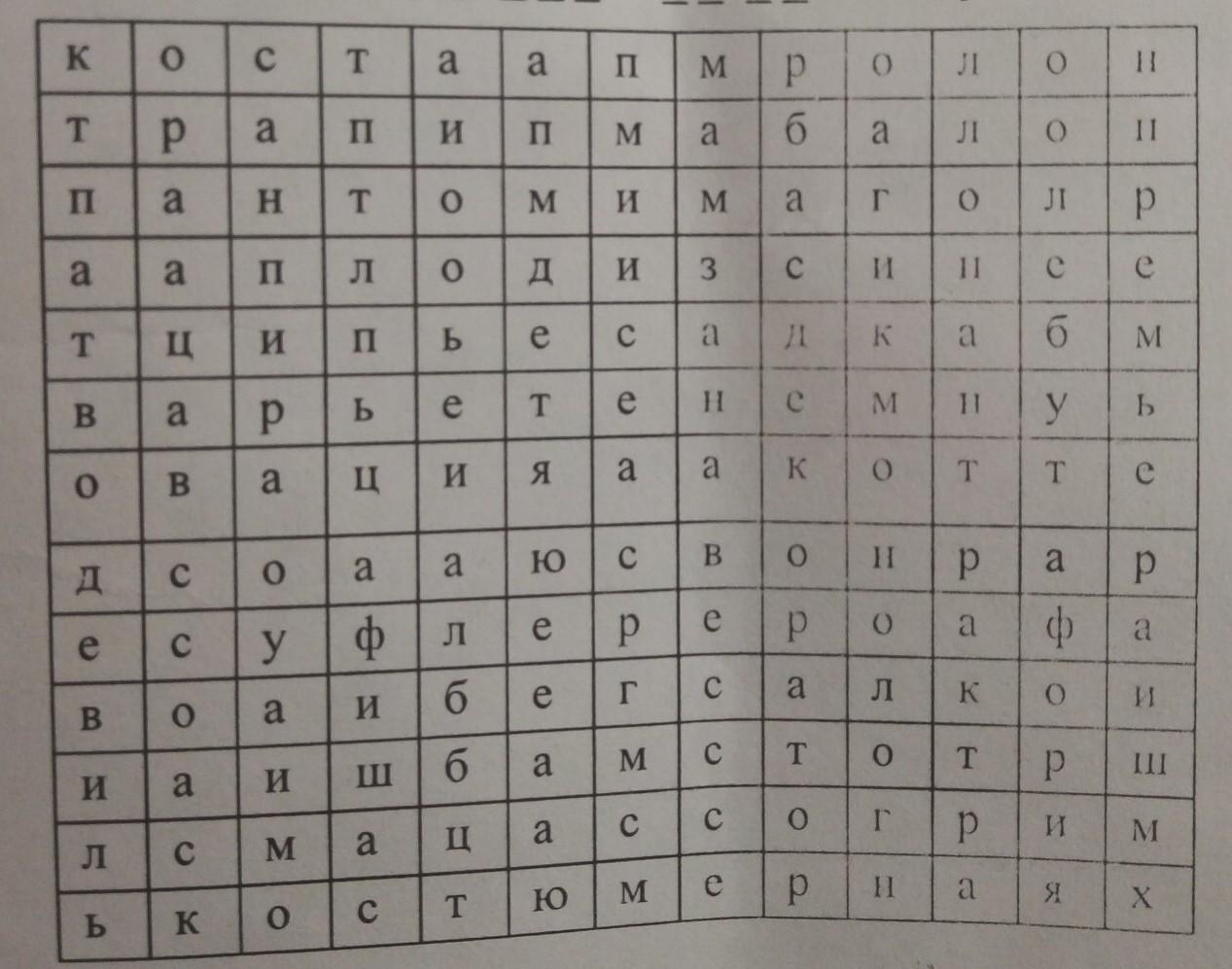 Найдите в предложенном буквенном кубе слова связанные с театральным исскуством, подсказка их 15