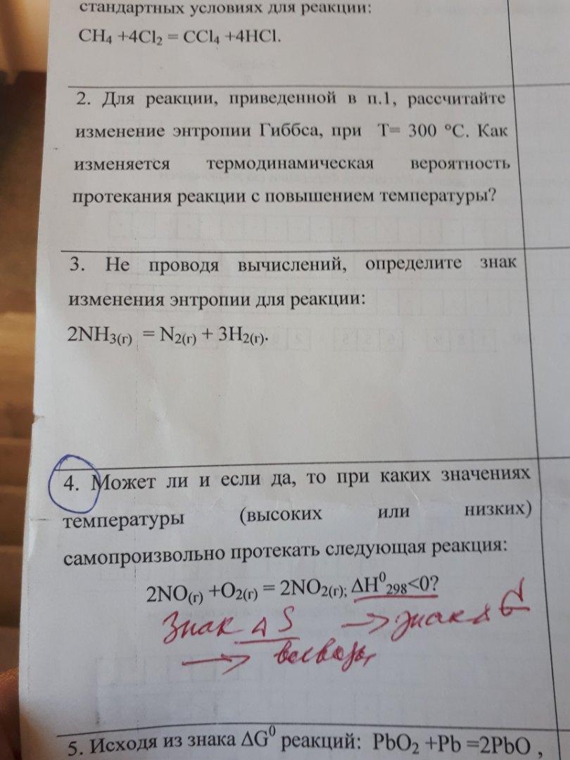 При высокой температуре образуется NO, т.к. ∆Sх.р. > 0, т.е. при увеличении температуры (T) значение энергии Гиббса станет меньше нуля и реакция образования NO станет возможной.