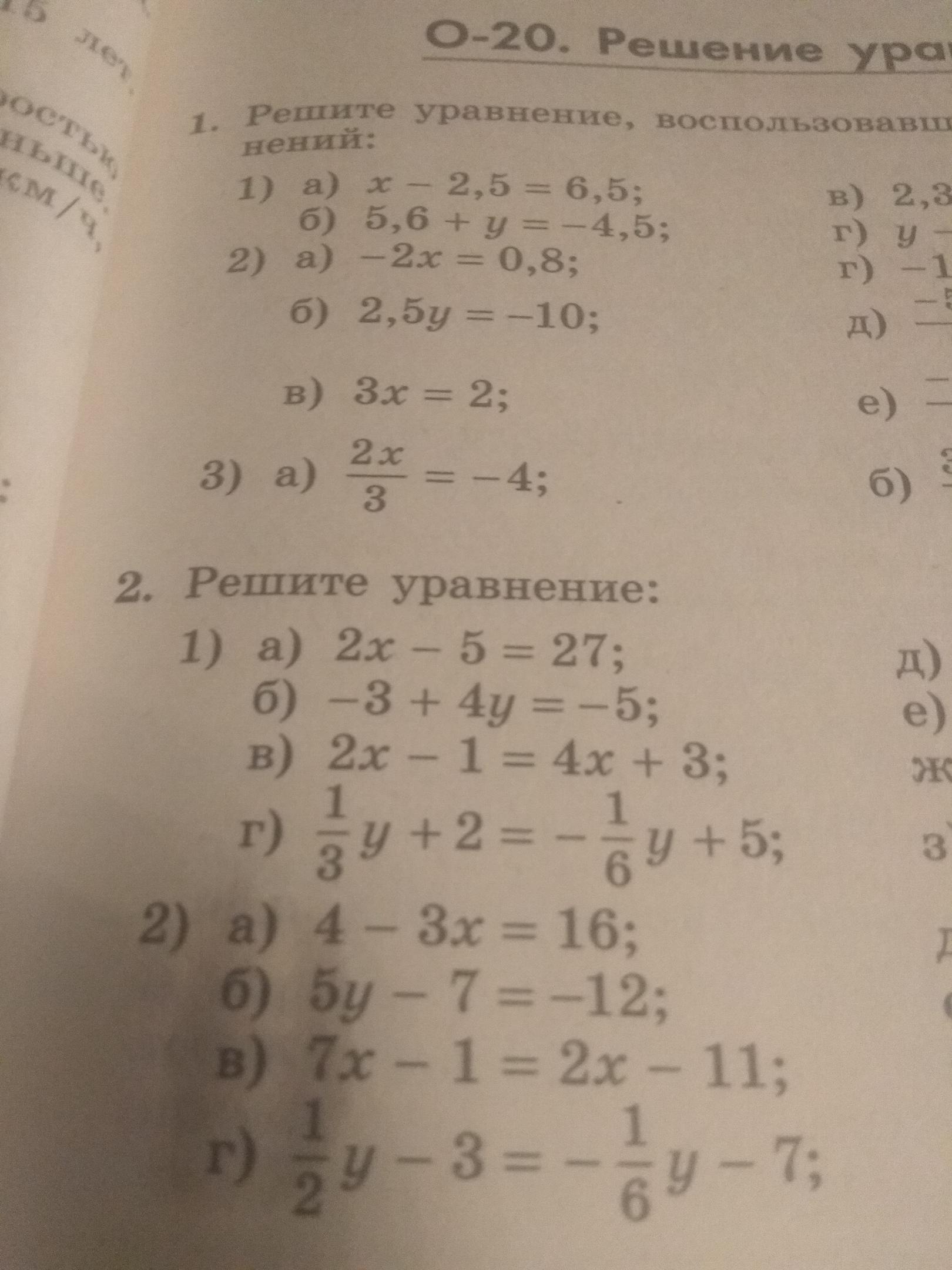 в)2x-1=4x+3 г)1/3y+2=-1/6y+5