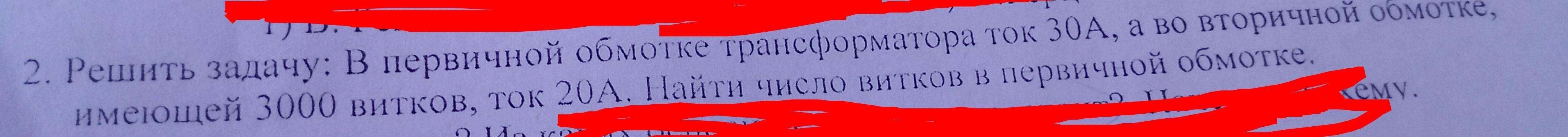 В первичной обмотке трансформатора ток 30А а во второй обмотке имеющей 3000 витков ток 20А Найти число витков в первичной обмотке