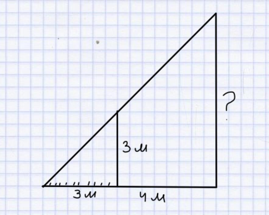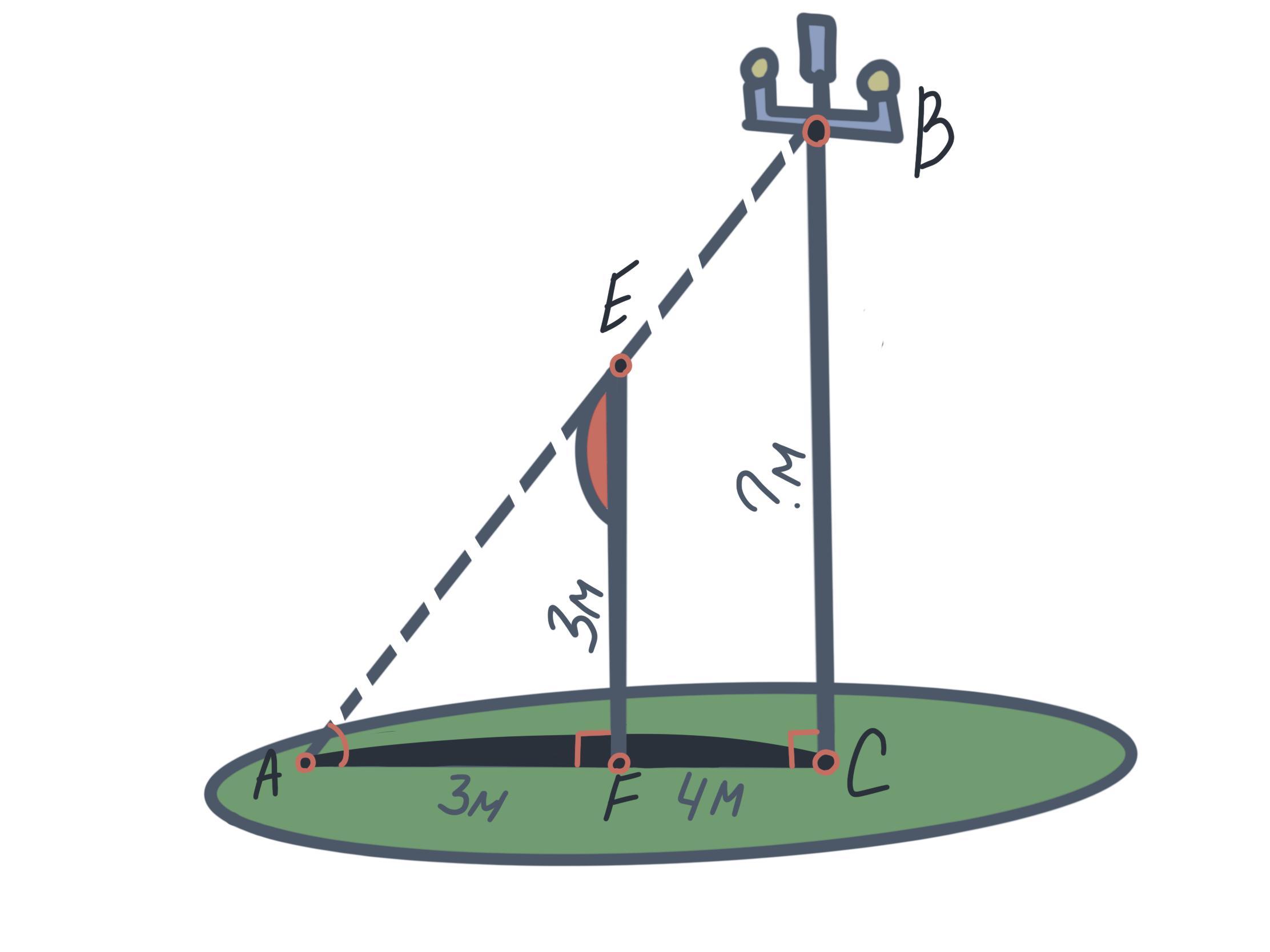 Дорожный знак высотой 3 метра расположен на расстоянии 4 метров от электрического столба. Тень от дорожного знака составляет 3 метра. Определите высоту электричего столба.