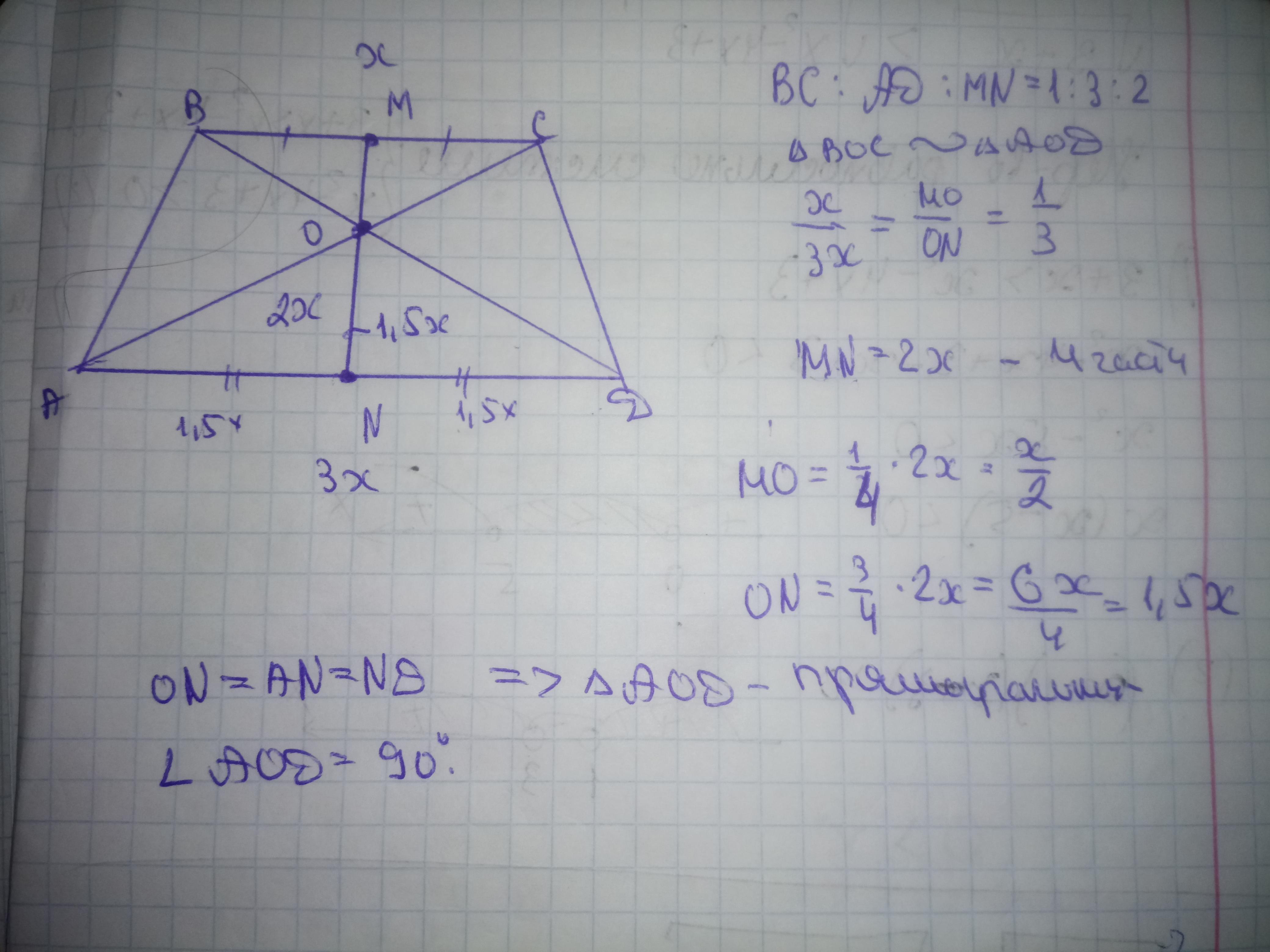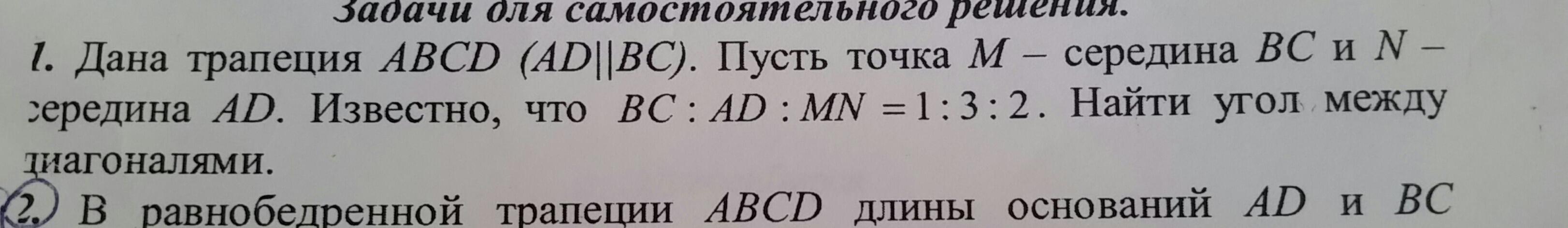 Пусть BC =x; AD=3x; MN=2x. Проведем прямую через C параллельно BD; E - точка пересечения этой прямой с продолжением стороны AD; получаем треугольник ACE со стороной AE=3x+x=4x. Проведем прямую через C параллельно MN; F - точка пересечения этой прямой с AD. Имеем: CF=MN=2x; AF=AN+NF=1,5x+0,5x=2x. Таким образом, F является серединой стороны AE, откуда CF - медиана треугольника ACE, а поскольку она равна половине стороны, треугольник прямоугольный. Остается обратить внимание на то, что угол ACE равен углу между диагоналями.