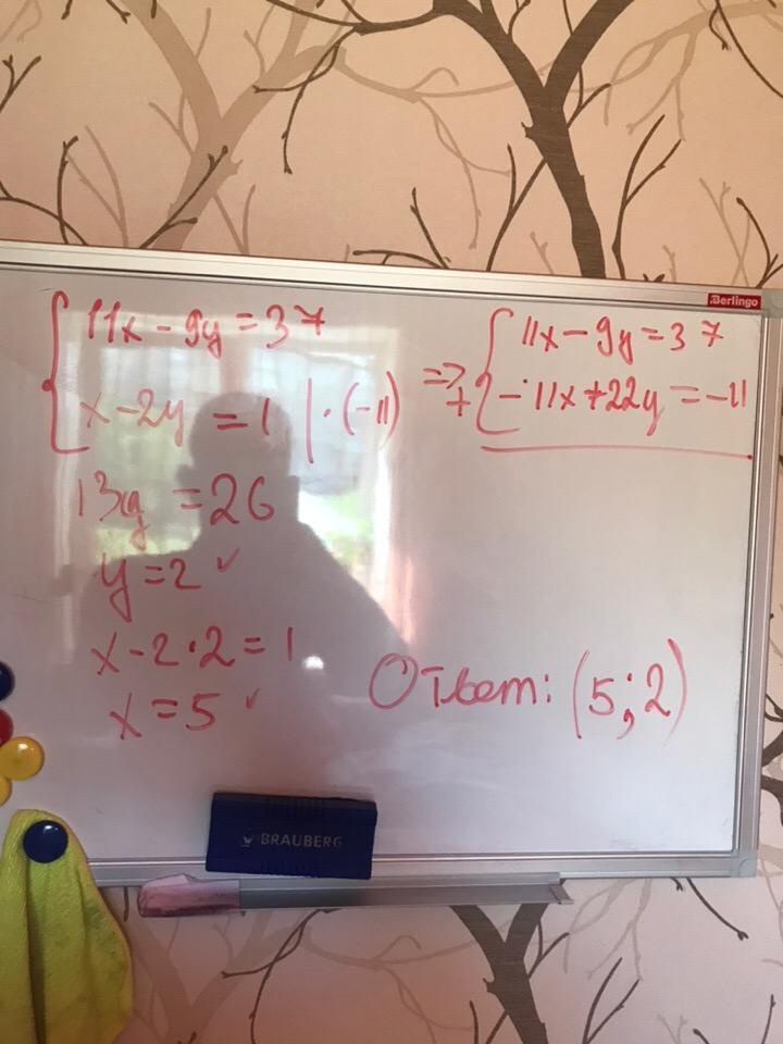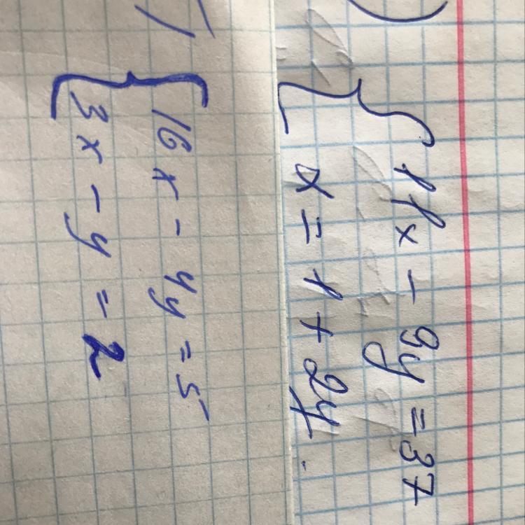 верхняя: подставляем в 1 уравнение системы: 11*(1+2y)-9y=37; 22y-9y+11=37; 22y-9y=37-11; 13y=26; y=26/13=2. x=1+2*2=1+4=5. Ответ: (5 ; 2). нижняя : y=3x-2. подставляем в 1 уравнение системы: 16x-4*(3x-2)=5; 16x-12x+8=5; 16x-12x=5-8; 4x= -3; x= -3/4. y=3*(-3/4)-2= -9/4-2= -4 1/4. Ответ: ( -3/4 ; -4 1/4).