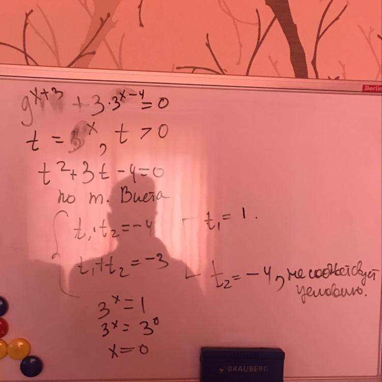 Пошаговое объяснение:пусть 3^x=t, t>0 тогда t^2+3t-4=0 по теореме Виета t=1 или t=-4 -не подходит, так как t>0
