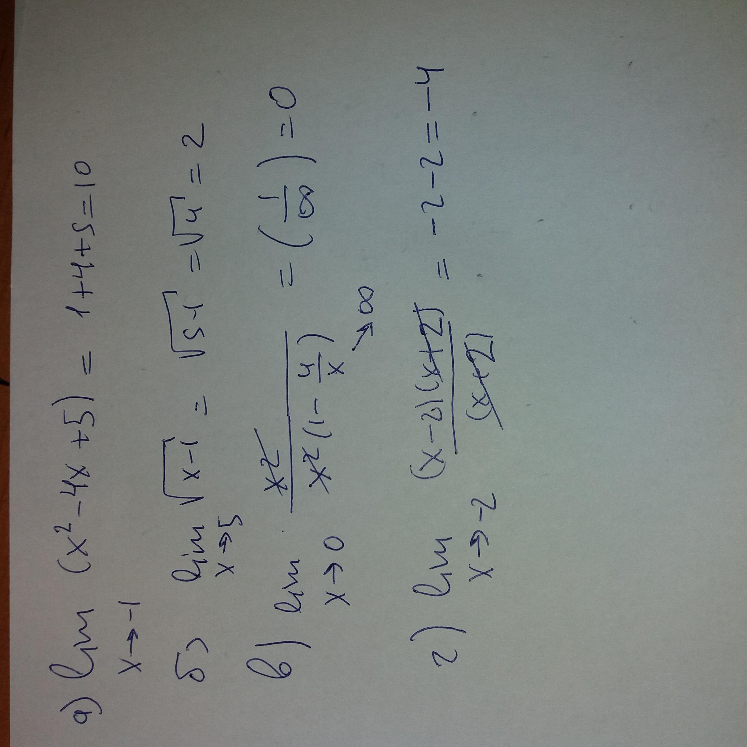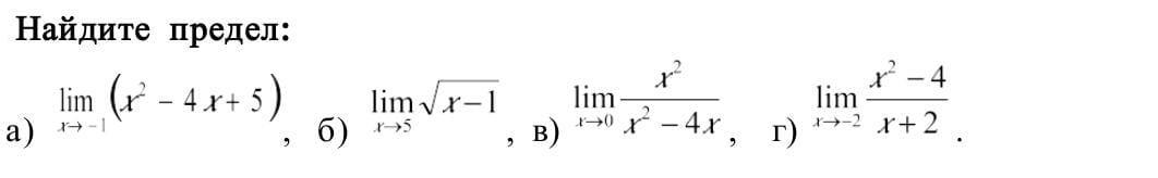 г) Разложим числитель как разность квадратов и сократим дробь, получим (х-2)*(х+2)/(х+2)=х-2, теперь можно брать предел, он будет равен -2-2= - 4